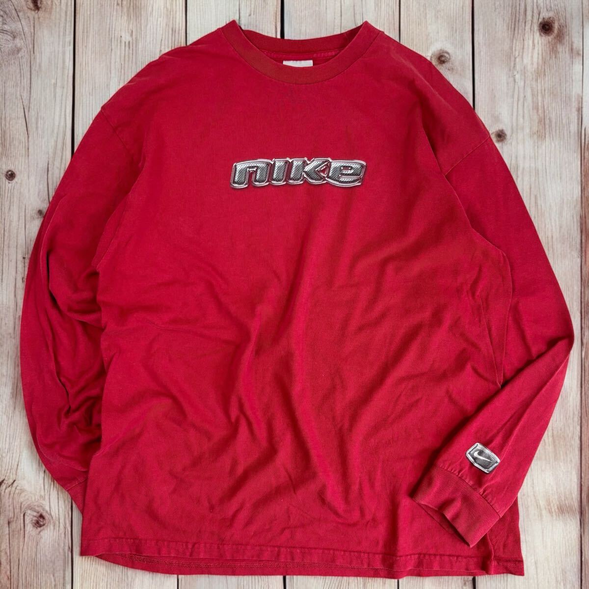 > 00s NIKE ナイキ USA製 3Dロゴ Y2K ヴィンテージ 長袖 ロンT クルーネック レッド系 ストリート スケボー ビッグサイズ メンズ Lサイズ