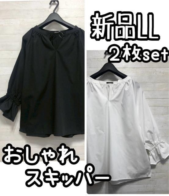 - 新品☆LL♪白&黒♪おしゃれな7分袖スキッパーブラウス2枚セット♪☆G940