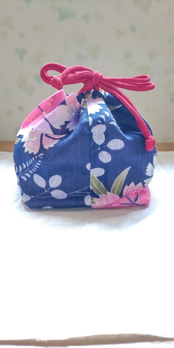 - 浴衣地巾着(紺地に撫子と萩)・B品