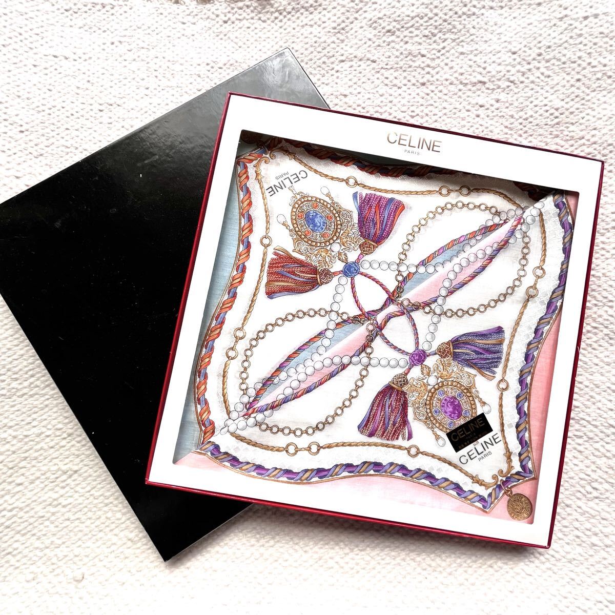 - 未使用 CELINE セリーヌ ハンカチ ブランドハンカチ ギフト 2枚セット ジュエリー ライトピンク ライトブルー 箱付き 綿 ヴィンテージ