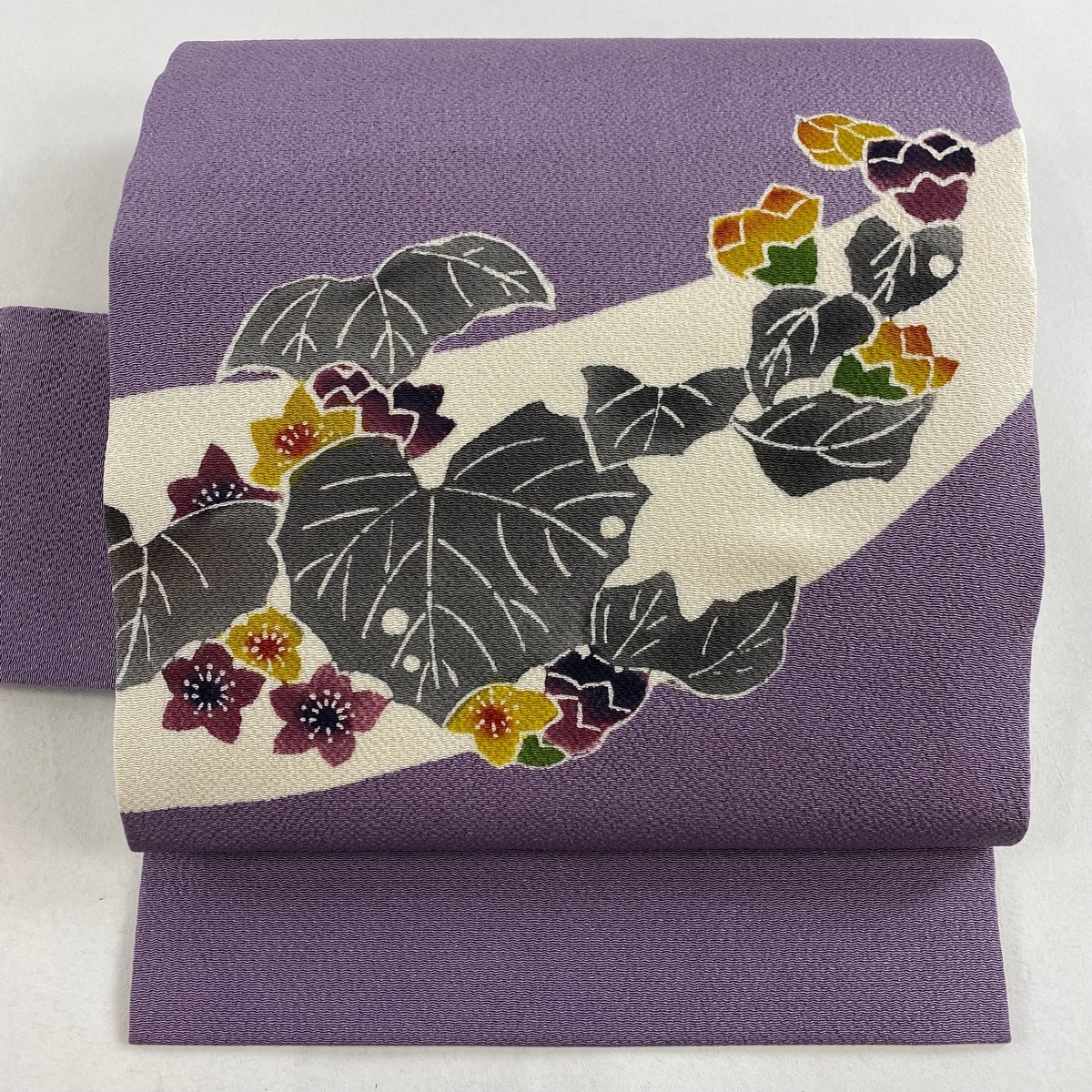 - 名古屋帯 名品 落款 花 蔦 縮緬 紫 正絹 【中古】