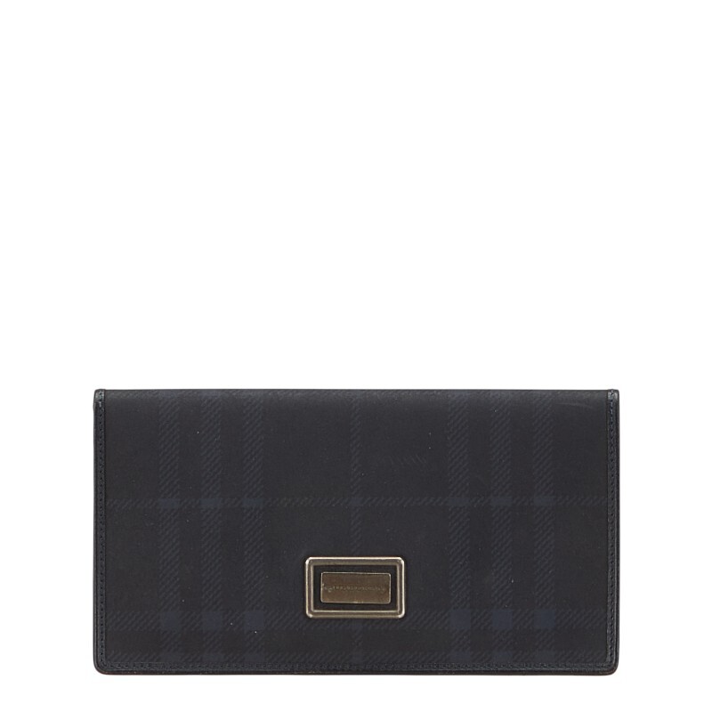 > バーバリー チェック 長財布 ブラック ネイビー スウェット レザー レディース BURBERRY 【中古】