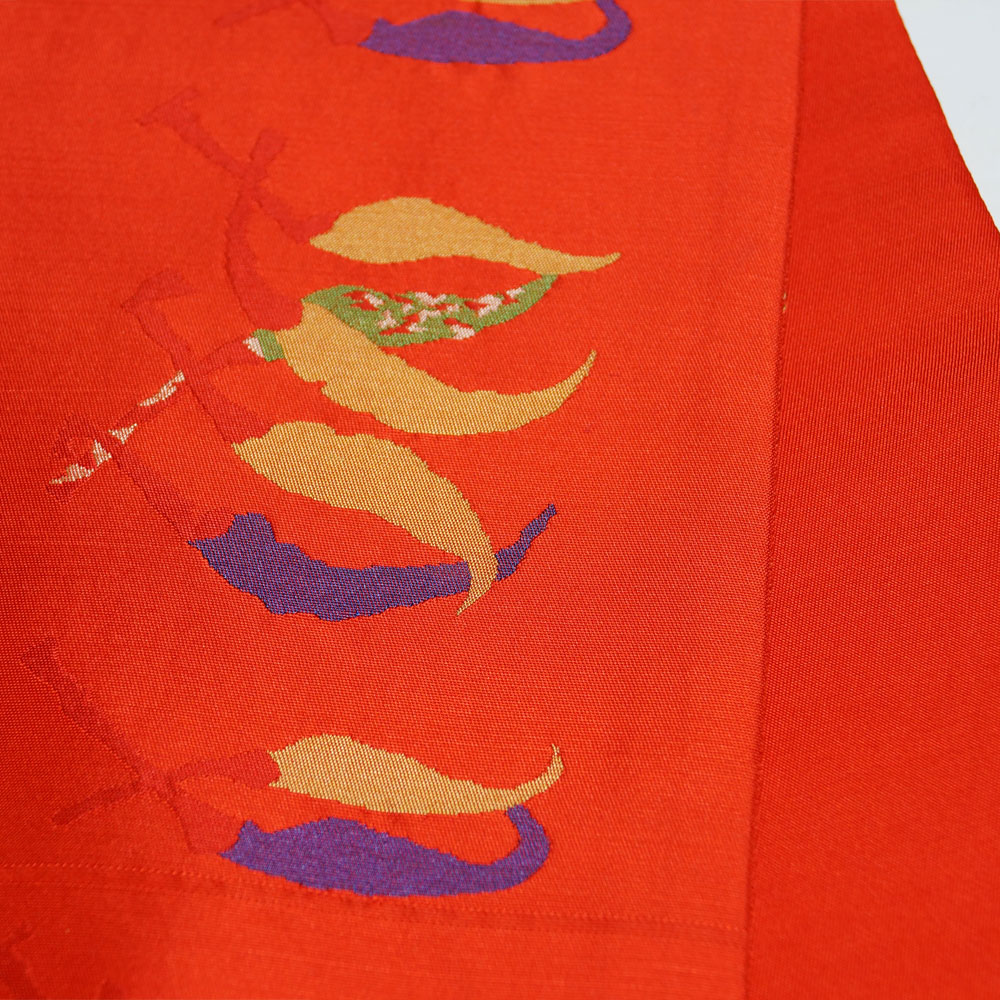- 小袋帯 正絹 唐辛子模様 紅緋色系 正絹 全通 半幅帯 四寸帯 半巾帯 浴衣帯 帯 中古 リサイクル着物 細帯 浴衣 博多