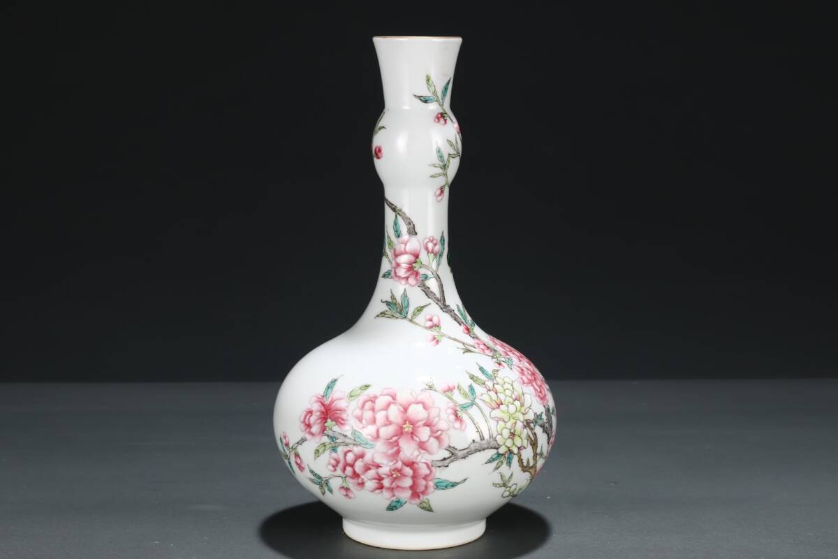 > 清時代 乾隆 粉彩 花卉蝴蝶文描金双節瓶 唐物 箱付き 陶磁器 中国美術 古美術 置物 高さ26.5cm 胴径14.5cm RG552