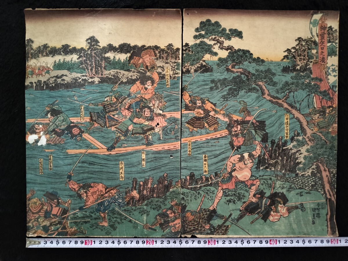 > 江戸期/真作 歌川国貞「神霊矢口之渡」本物浮世絵木版画 武者絵 戦争絵 合戦絵 錦絵 大判 裏打ち 二枚続き
