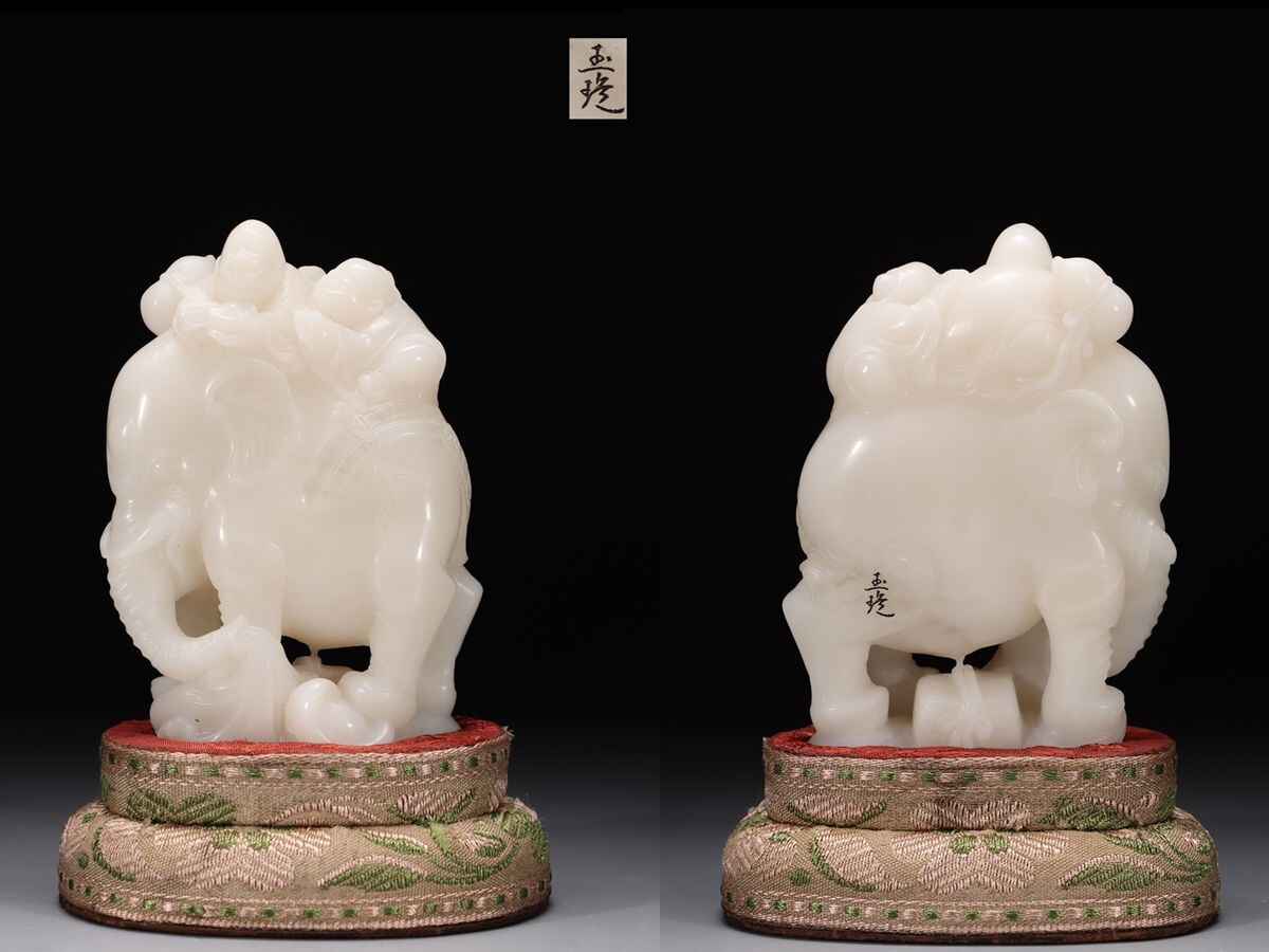 - 「清 玉セン 老寿山石 ライチ凍石彫り 童子洗象擺件」極細工 擺件 古賞物 中国古美術 旧蔵出