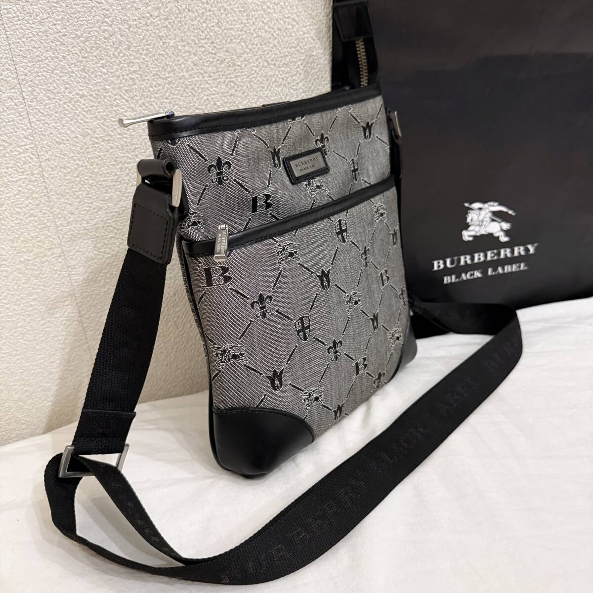 > BURBERRY BLACK LABEL バーバリーブラックレーベル キャンバス&本革 スリムミニショルダーバッグ サコッシュ モノグラム グレー 黒 #3182