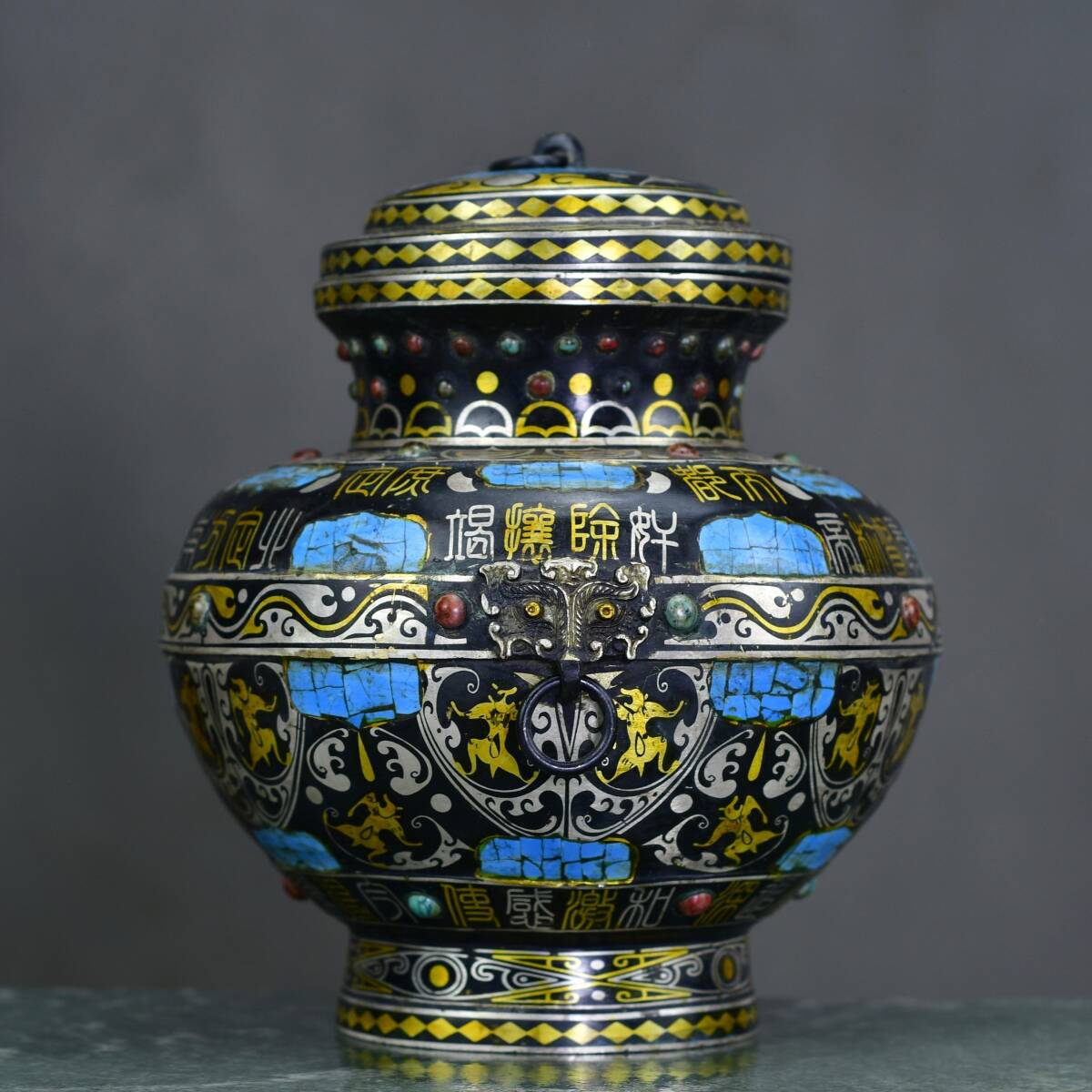 - ◆珍蔵◆中国古美術 戰漢 古銅製 青銅器 錯金 錯銀 銘文盖瓶 細密細工造 置物 擺件 古賞物 時代物 AT17
