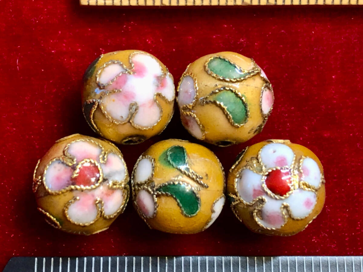 - ¶!¶ 有線七宝焼ワールド - 5個丸玉で1単位 ¶!¶ 約Φ12㎜ラウンド玉 金線に土色釉緑葉ピンク花 手作 手芸 工芸 インテリア 趣味