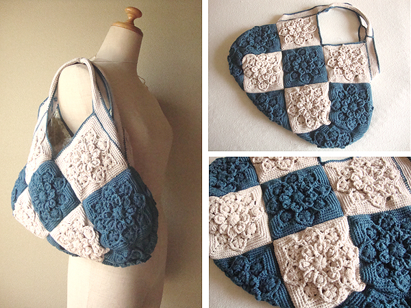 - 新品 ハンドメイド 手編み 花 立体 モチーフ グラニーバッグ 青系×ベージュ 綿麻 リネン コットン かぎ針