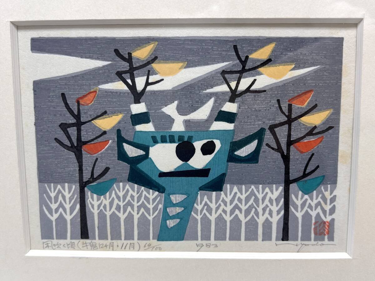 > 真作 限定100部 兵頭俊朗『風吹く頃』牛鬼 1983年 木版画 版画家 直筆サイン エディション入り 魔除け 厄除け 額装 美術品 アート D