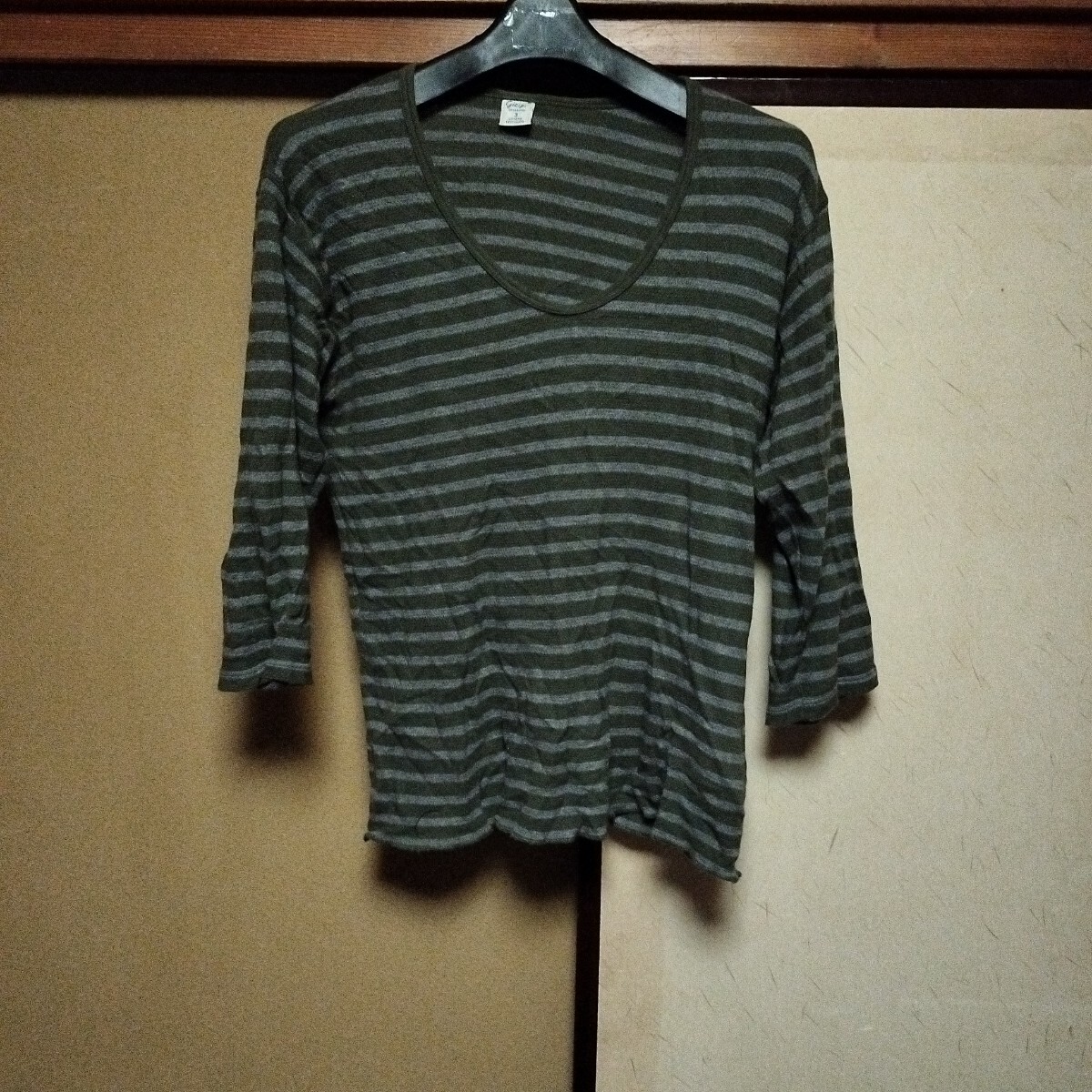 - イタリア製gicipiオリーブ×グレーUネックボーダー カットソー7部袖サイズ3