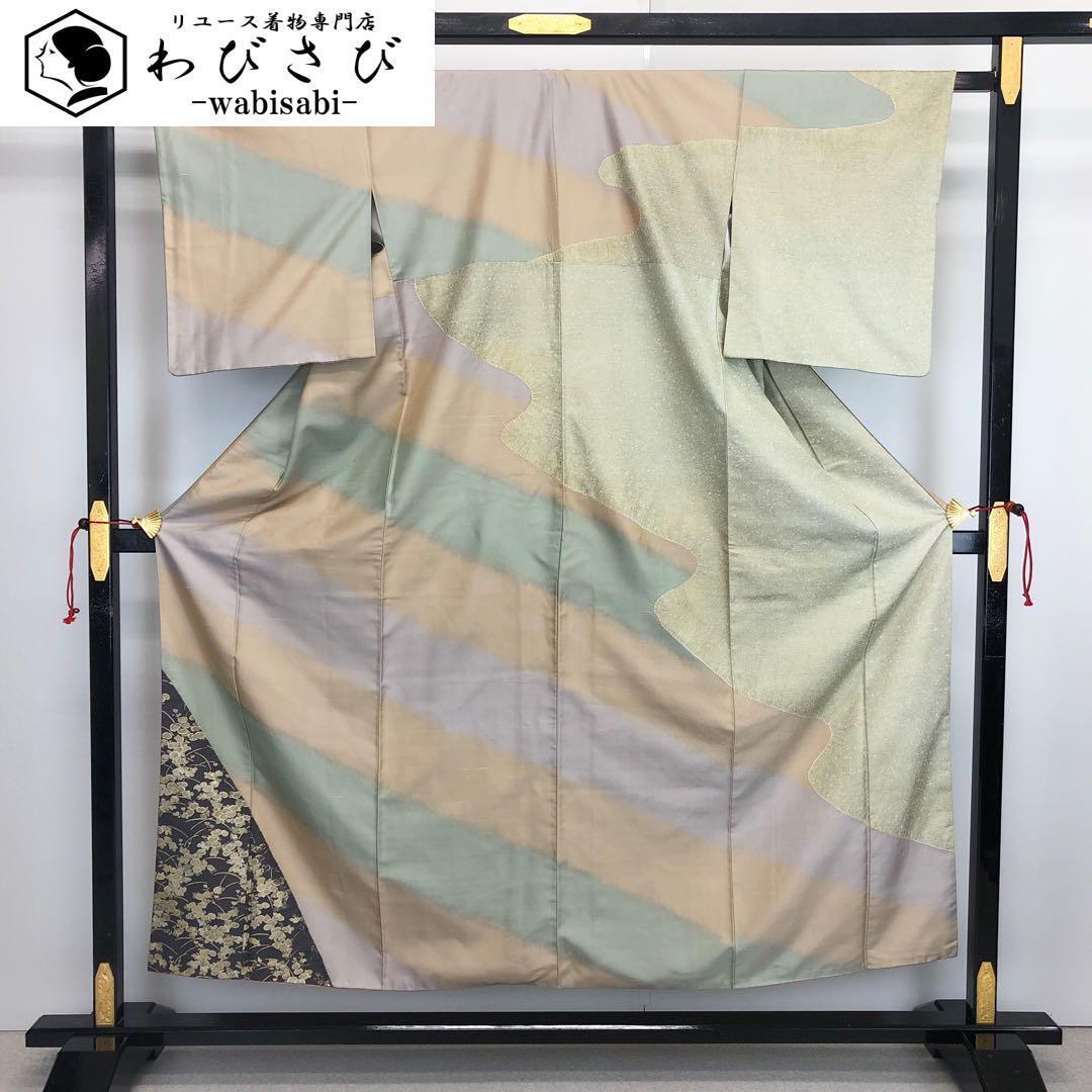> 訪問着 パステル調染め色 金彩万寿菊 絞り 紬 K-3500 着物 きもの kimono 和服 和装 中古 リサイクル着物 【送料無料】