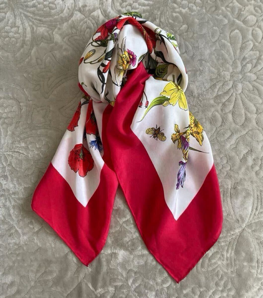 - Roxy スカーフ シルク100% 花柄 百合 カーネーション 蝶々 てんとう虫 赤 アイボリー 絹 大判 ロキシー イタリア製