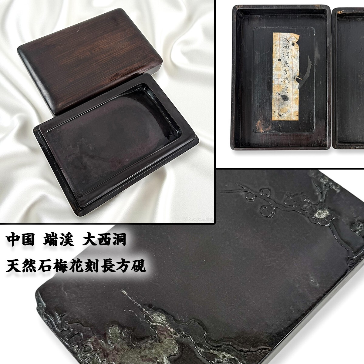 - 中国 端渓 大西洞 天然石梅花刻長方硯 黒檀硯箱入 古硯 唐硯 書家収蔵品 文房四宝 書道具 すずり 20250907-45