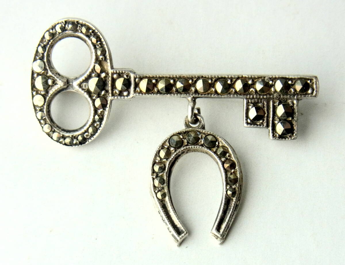 > 美 アンティーク 純銀シルバー800 マーカサイトのブローチ 鍵とシューホース 馬蹄のドロップ 幸運のシンボル 骨董 クロネコ宅急便60サイズ