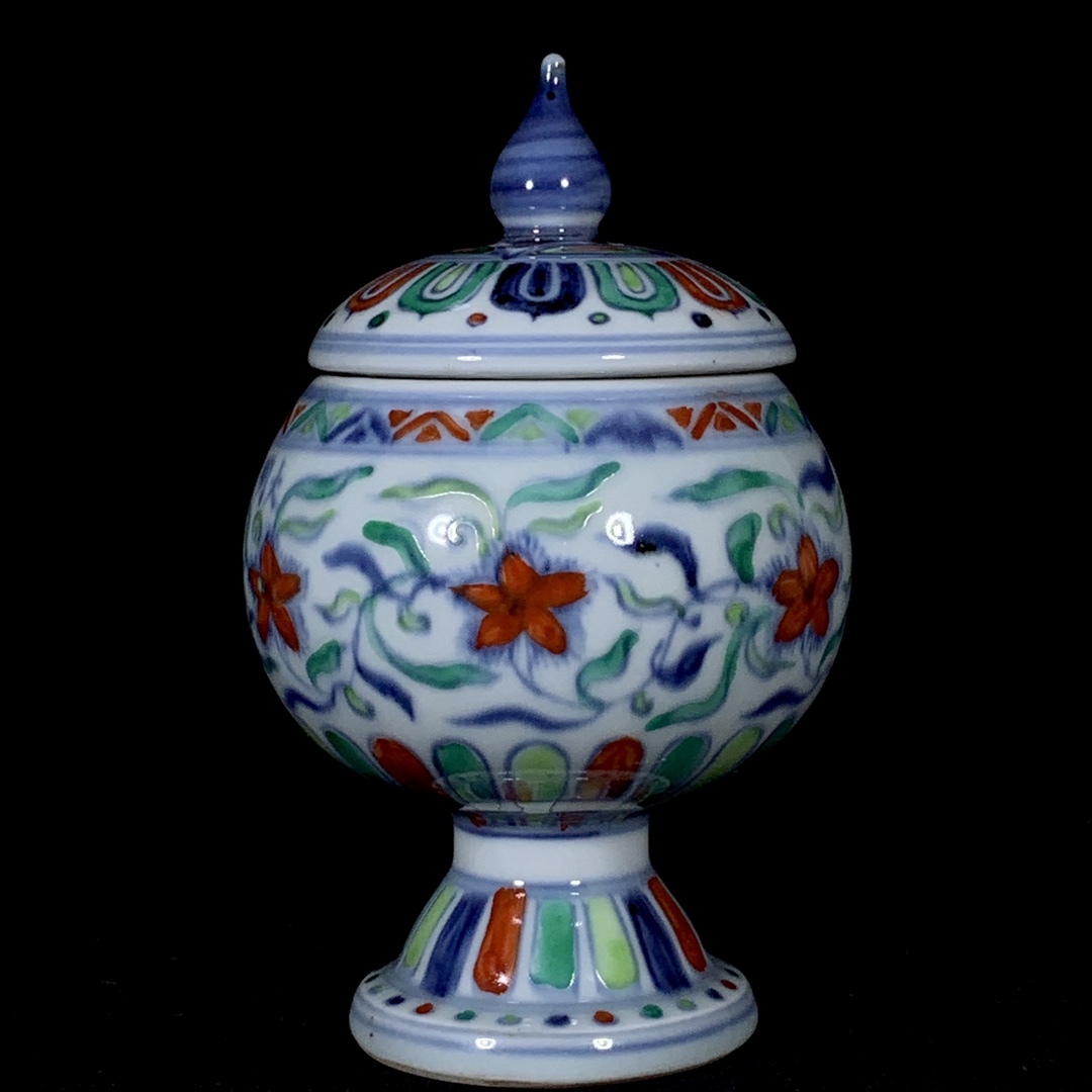 - 9+GV8573「東洋美術」 中国骨董 人間国宝 磁器製品【明宣徳青白多色花模様豆】 旧物 孤品 珍品 陶磁器 収蔵価値が高い