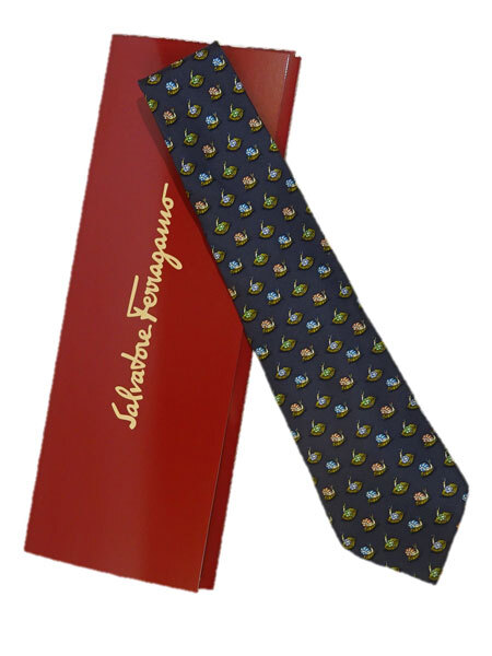 ネイビーとグレーの中間のような色の品です。■新古品・未使用品■Salvatore Ferragamo■イタリア製■2つ折りの状態:約71cm■最大幅:約9.5cm■シルク100% プリント地■ブランド箱付き※実物と色や質感が多少異なってみえる場合があります。