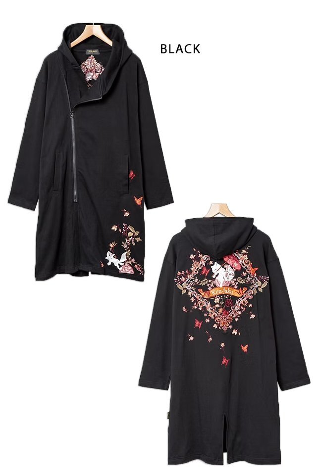 - ビサンチンの花刺繍斜めジップロングパーカー◆今昔 ブラック XLサイズ KJ-29254 和柄 和風 狐 きつね キツネ ユニセックス
