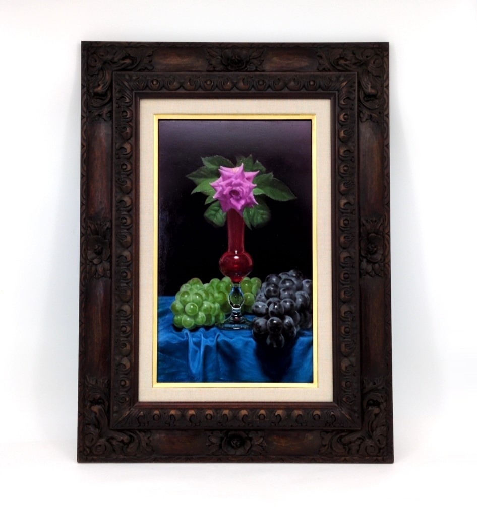 - 【真作保証】 三嶋哲也 油彩画 P6号 「薔薇とぶどう」 板に油彩 / 油彩