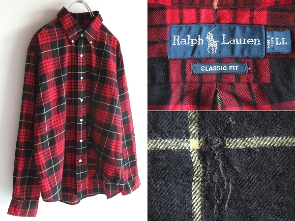 > 希少 00sビンテージ Ralph Lauren ラルフローレン CLASSIC FIT ポロポニーロゴ刺繍 チェックシャツ ネルシャツ LL XL レッド ブラック 赤黒