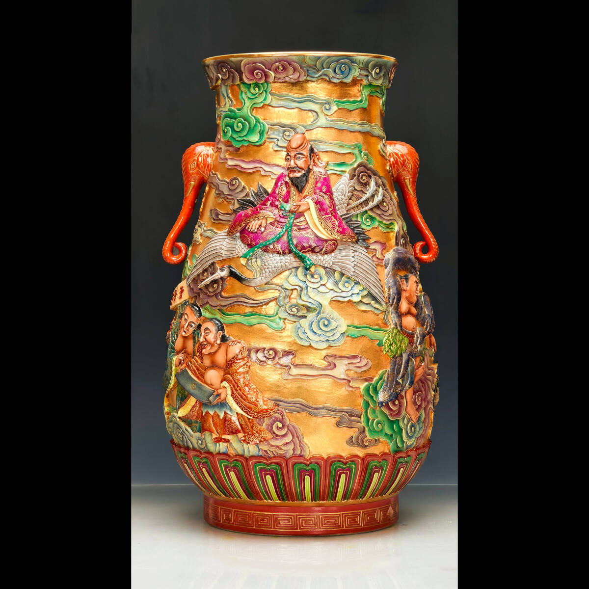 - 多宝閣 ■ 208853 中国磁器 中国骨董【官窯【清代乾隆年間作】金地・エナメル高浮彫磁器「八仙祝誕生日図象鼻花瓶」】 置物 收藏品 孤品