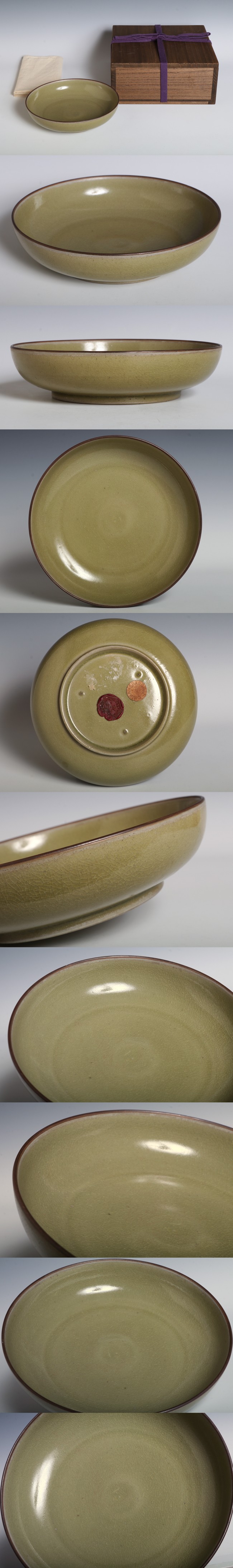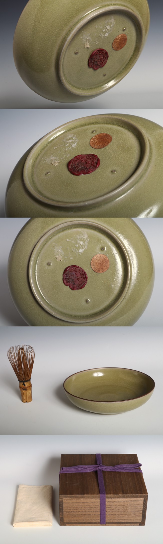 - 9557 中国陶器 青磁盤(蝋印付) 四方桟木箱 約16cm 皿 筆洗 水差 書道具 文房具 検:青磁 青瓷 龍泉窯 中国 古玩 唐物 時代陶器
