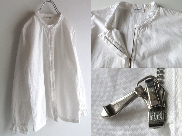 - 希少 フランス製 90sビンテージ agnes b. アニエスベー レース装飾 ririジップ スタンドカラーシャツ ブラウス 40 ホワイト 白 ネコポス可