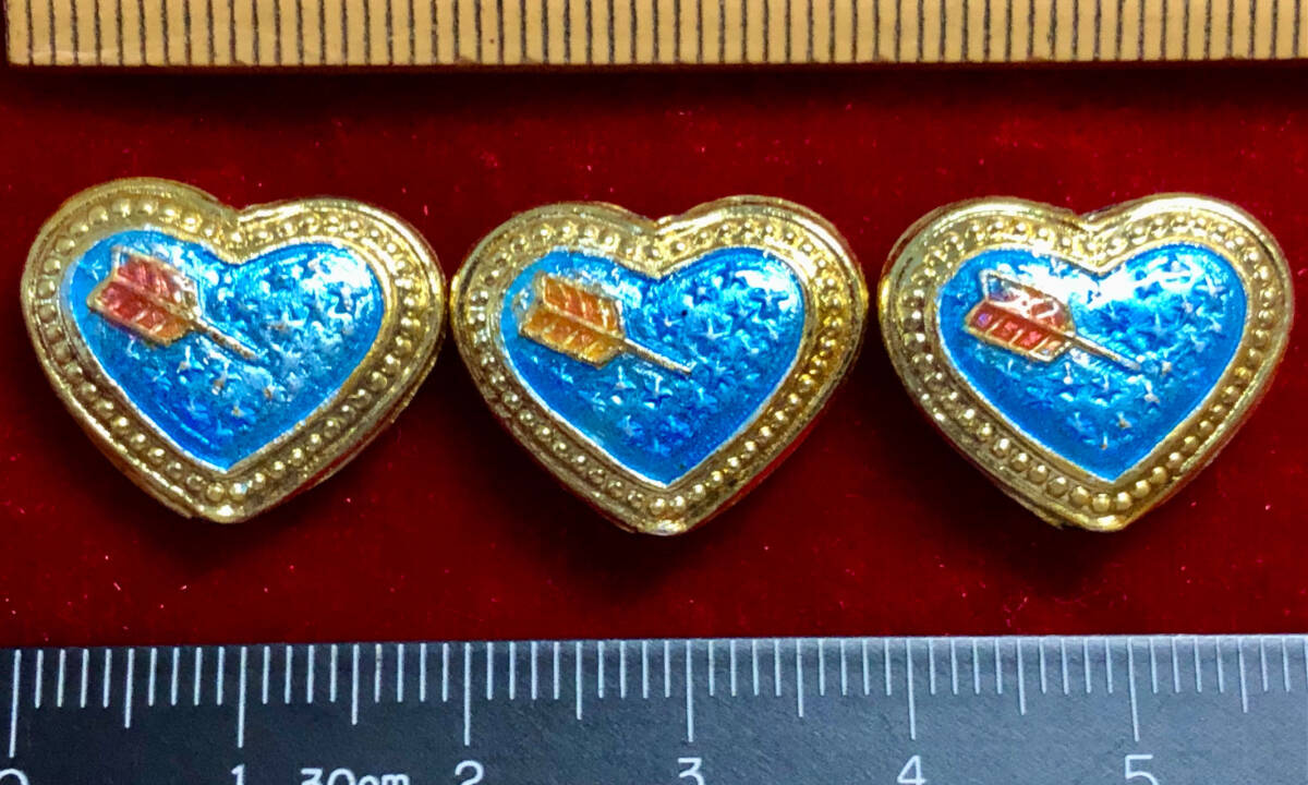 > ¶!¶ 有線七宝焼ワールド - 3個のハート型ペンダント ¶!¶ 約厚6㎜×横18㎜×縦15㎜ 金線に水色釉橙色愛の矢 手作 手芸 工芸 インテリア