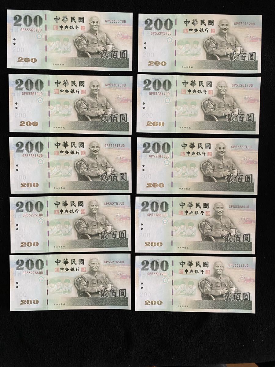 - 3、台湾 紙幣 200 TWD x 10枚 セット (合計2000TWD)