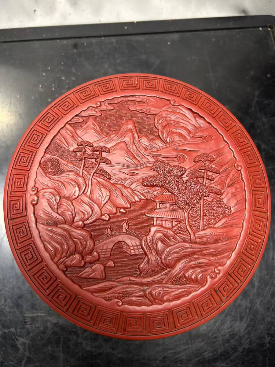 - 旧家収蔵品 堆朱山水楼閣文彫刻 高級漆器 天然木 漆塗 朱塗 雙層 菓子器