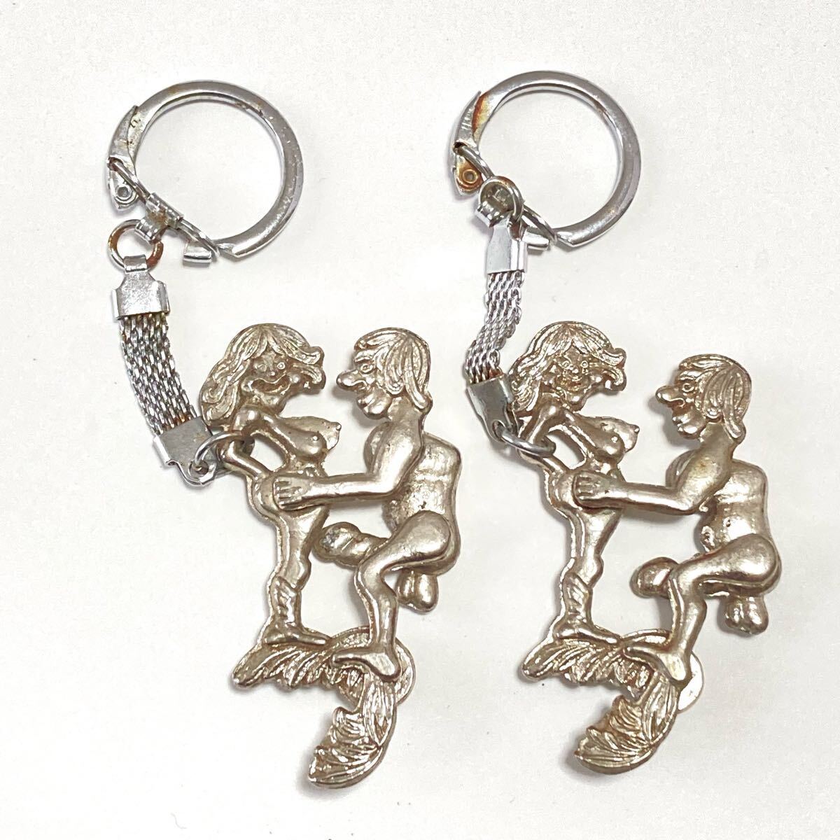 > 当時物ヴィンテージキーホルダー2個セットまとめ エロ カップル アダルト アクション シルバーカラー 秘宝館 キーリング 昭和レトロ
