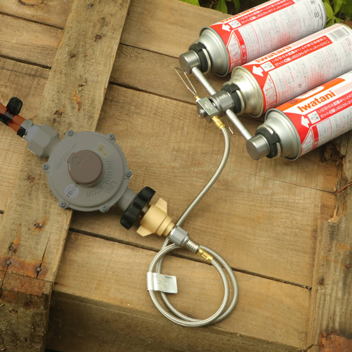 - 【送料無料】カセットボンベ 3連アダプタ & バルブ付きホース & ガス減圧器(調整器)変換アダプタ セット キャンピングカー 災害対策