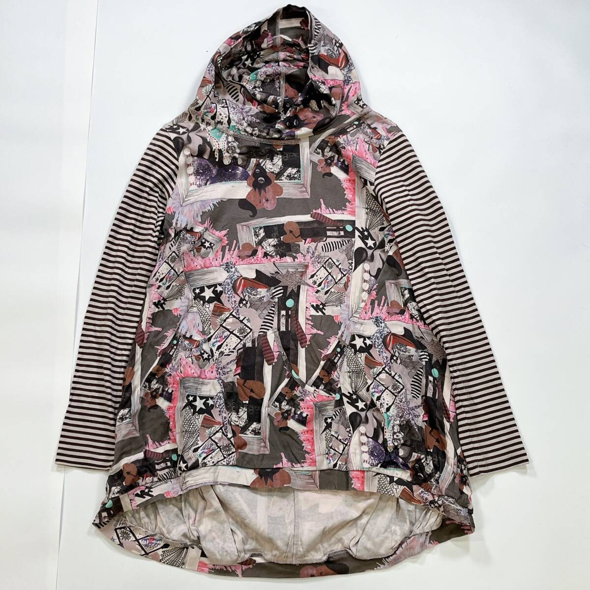 > Cube-Cube キューブキューブ センソユニコ フード付き チュニック トップス 38 M ロング丈 パーカー おしゃれ ボーダー 総柄 ☆399y