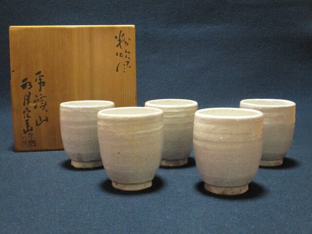 - 虎渓山 水月窯 粉吹風 湯呑 5客 未使用 共箱