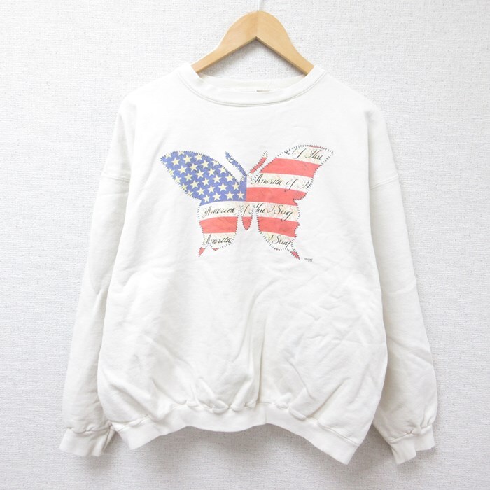 - XL/古着 長袖 スウェット メンズ 90s 蝶 星条旗 クルーネック 生成り 23dec14 中古 スエット トレーナー トップス