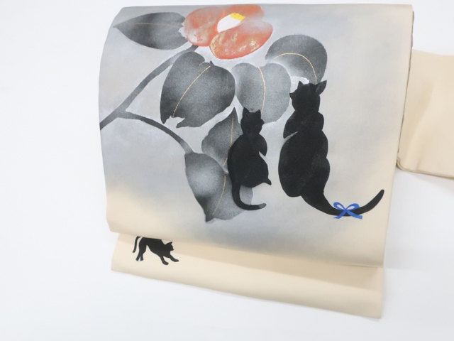 - 《古美術京松》リサイクル着物 九寸名古屋帯 オリジナル 落款入り 太鼓柄 花と猫 正絹 sok7b09-49