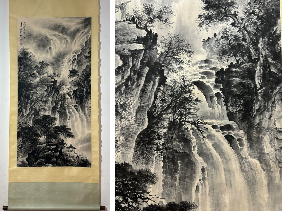 - 「董壽平畫 山水図」近代画家 肉筆紙本【仁】掛け軸 書画立軸 巻き物 中国書画 古美術 蔵出 畫芯約66×133.5cm