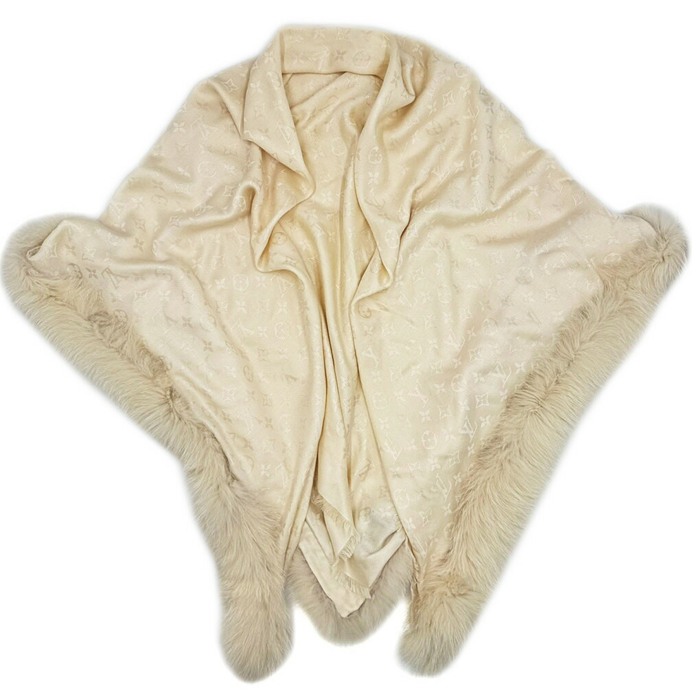 - 極美品 ルイヴィトン ショール LOUIS VUITTON M70172 ショール・モノグラム フリュール シルク ウール 毛皮 ファー付き オフホワイト 白