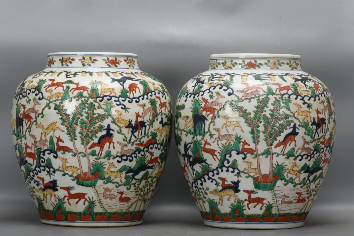 - ◆珍蔵◆中国古美術 大明嘉靖年製款 五彩 古陶磁 山鹿紋大罐―對 細密細工造 置物 擺件 古賞物 骨董 時代物 A04