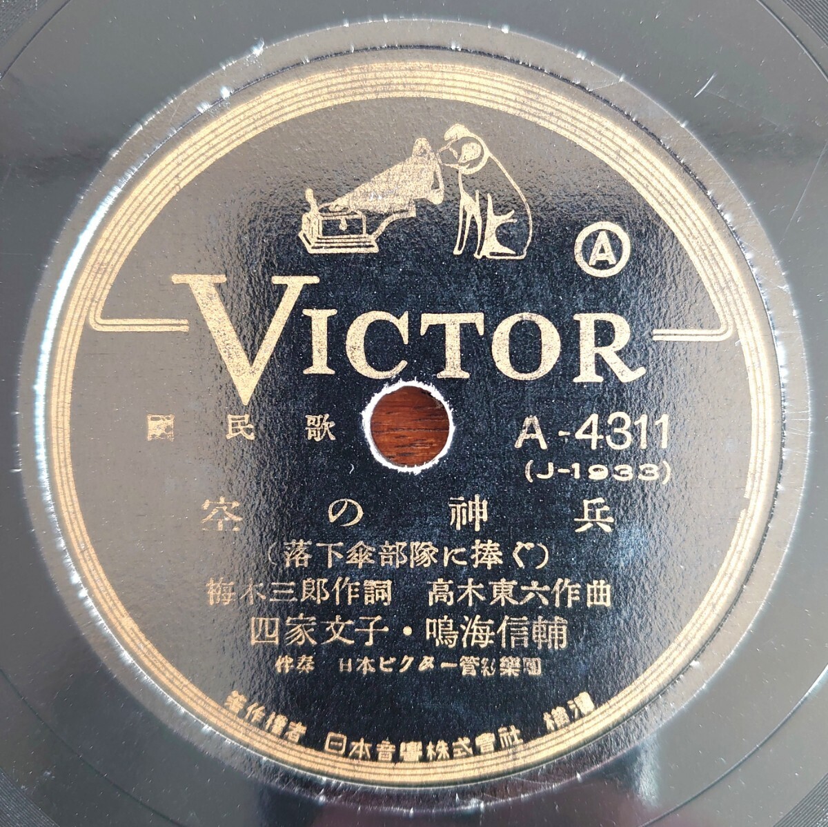- 【SP盤レコード/微凹/美盤】VICTOR A-4311 國民歌/空の神兵(落下傘部隊に捧ぐ) 四家文子.鳴海信輔/勇む銀輪(自轉車舞台に捧ぐ) 藤井典明