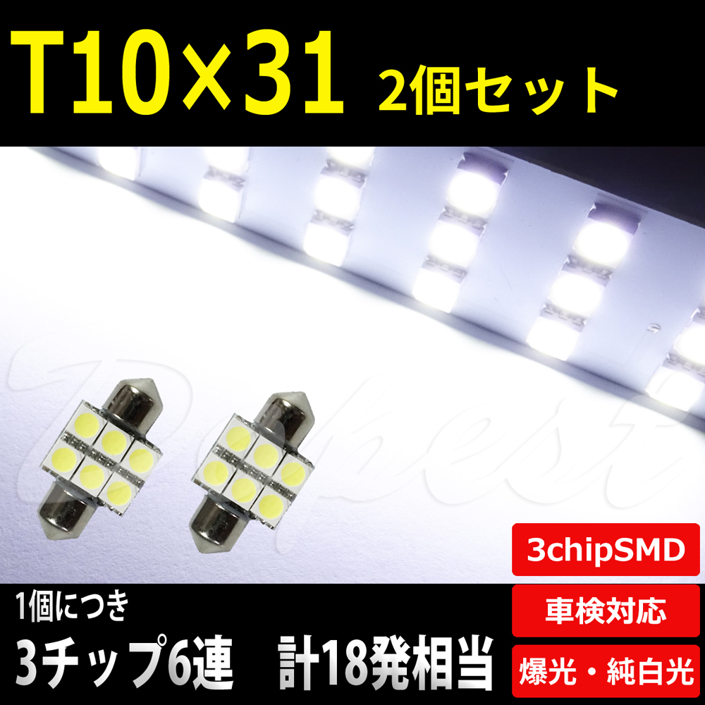 > LEDバルブ T10×31mm ルームランプ ラゲッジランプ 6500K純白 2個セット 車検対応 12V車専用 室内灯 6連