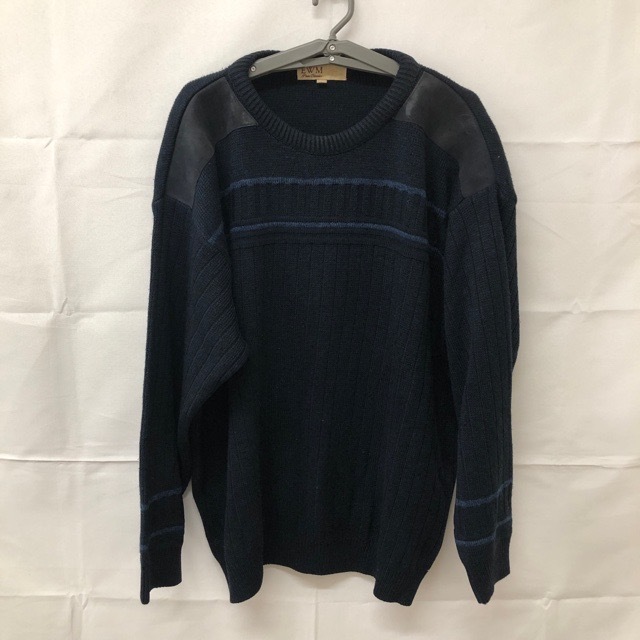 > A616 EWM L ユーロ古着 スエード切替 デザイン アクリル クルーネック 長袖 ニット セーター ネイビー系 EWM メンズ