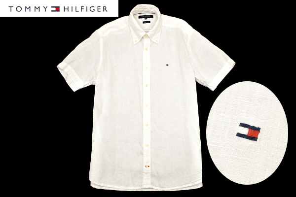 - Y-9772★送料無料★TOMMY HILFIGER トミーヒルフィガー Premium Linen★春夏涼しい麻 胸にロゴ刺繍 白 ボタンダウン 半袖 リネン シャツ M