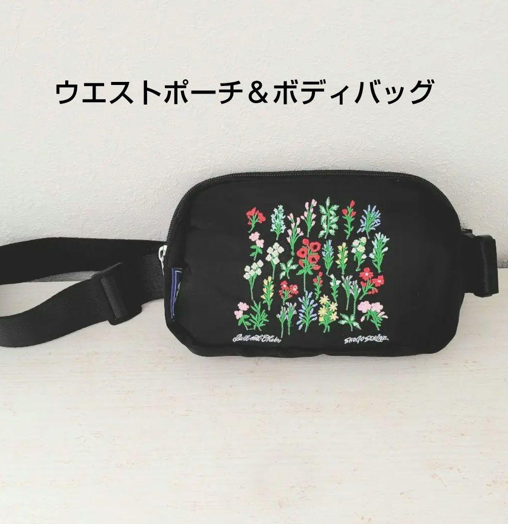 - 【新品】刺繍 ウエストポーチ ボディバッグ ボタニカル 花 草花 ブラック 黒