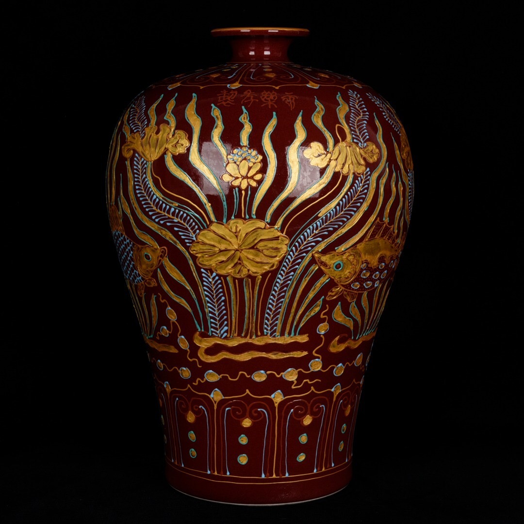 > 『明・永樂年製款・古陶瓷品・祭紅釉・瀝粉・描金・魚藻紋・梅瓶・染付・唐物』極細工 置物古賞物 中国古玩 中国古美術