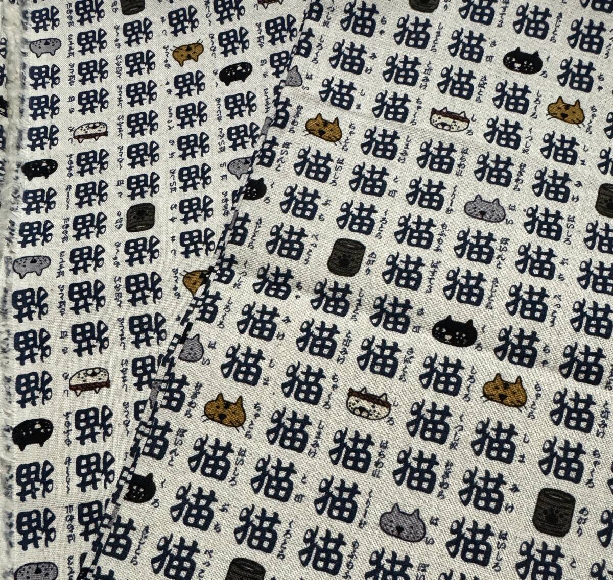 - 3.5m 綿麻キャンバス 110×350cm 猫 漢字 コットンこばやし / 生地 はぎれ 日本製 コットンリネン 綿85麻25 和風 WAGARA