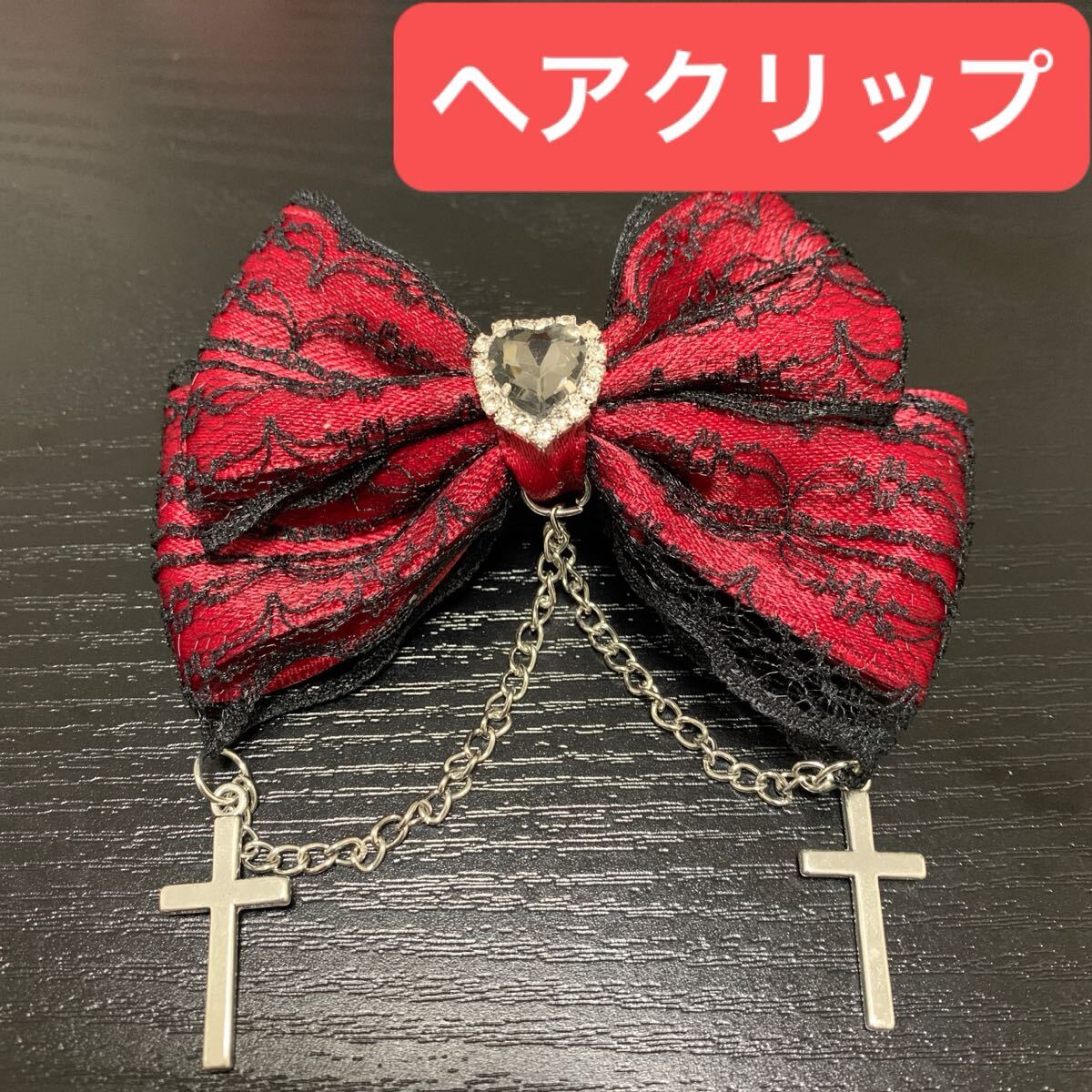 - 揺れる 十字架チャーム ハートビジュー レッド×ブラック リボン ヘアクリップ