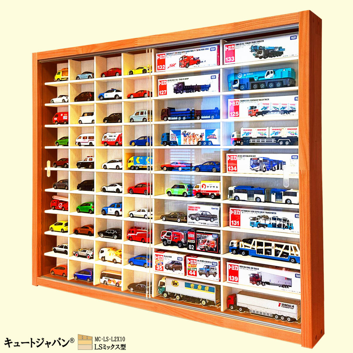 - 送料無料★ミニカー収納 ショーケース トミカ40台・ロングトミカ20台 アクリル障子付 メープル色塗装 日本製 LSミックス型