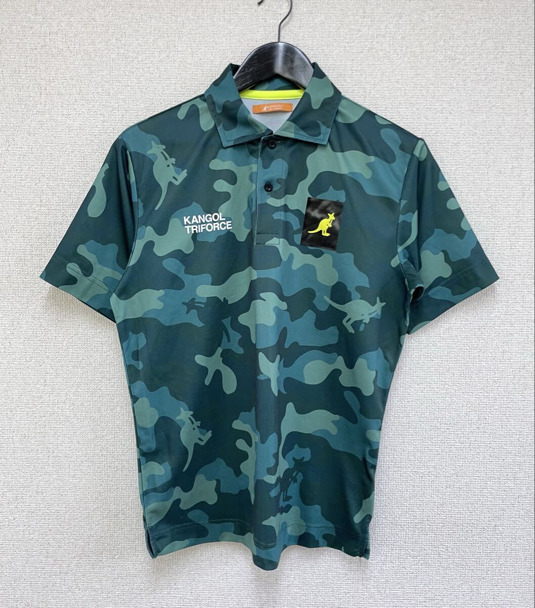 > 美品 KANGOL TRI-FORCE カンゴール 半袖 迷彩柄 ゴルフシャツ ポロシャツ メンズ Mサイズ ボックスロゴ ドライ素材 グリーン